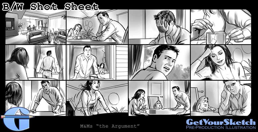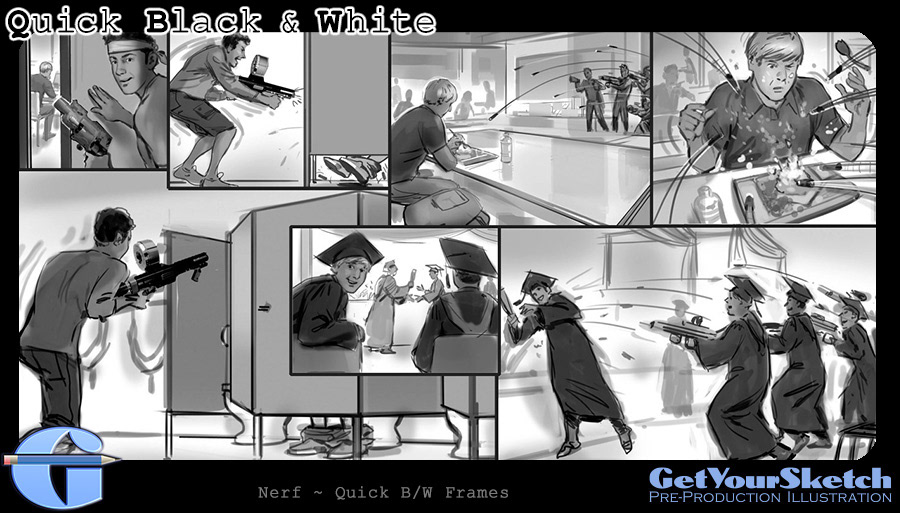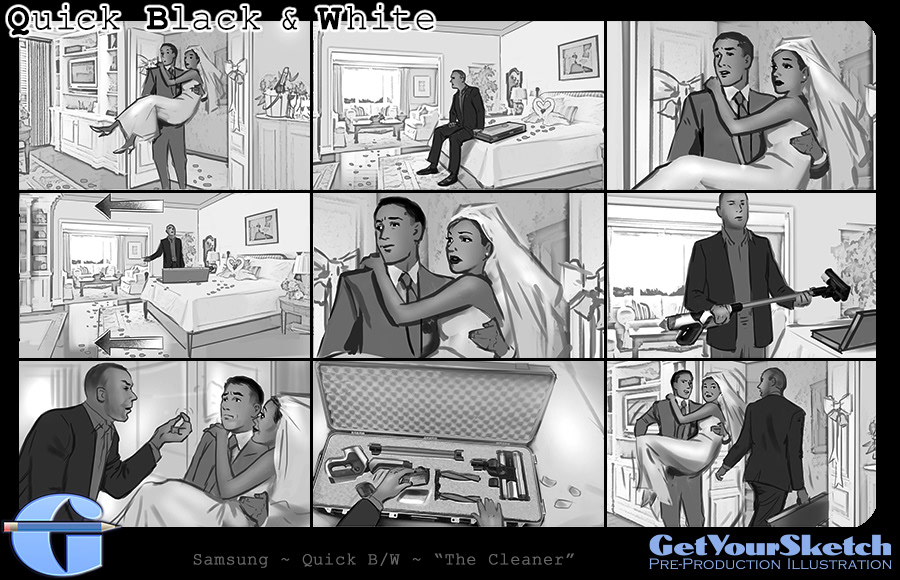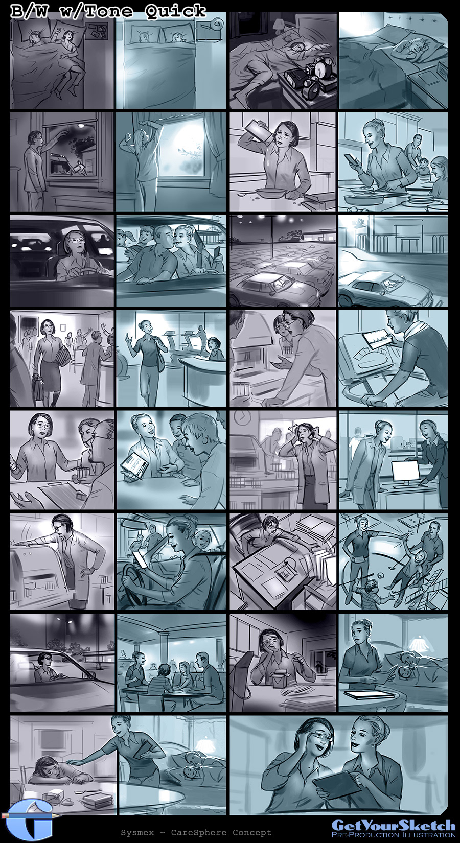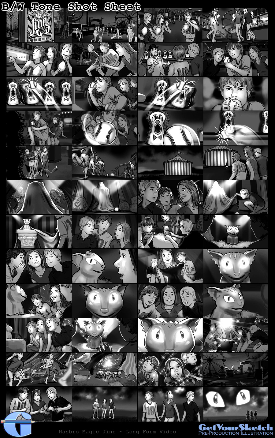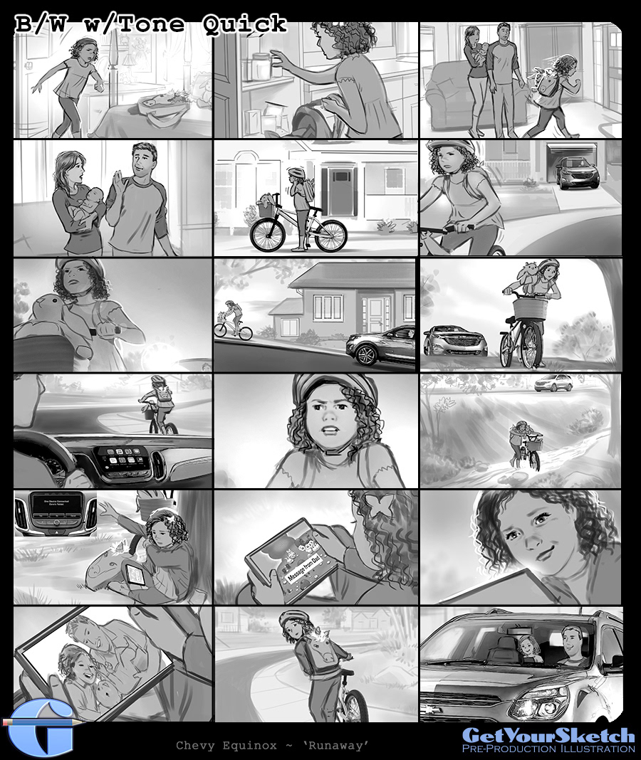 I typically like to handle all my storyboards with less heavy line, and more light and tone. I feel it helps convey the mood of the story better. Please visit